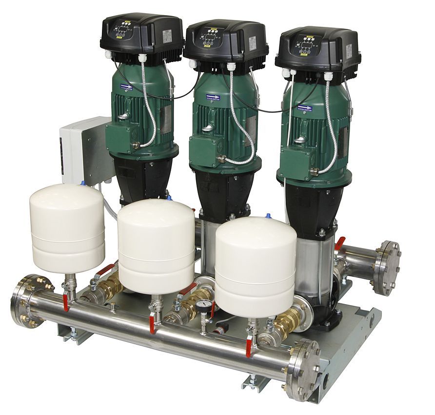 Eigenschappen en toepassingen Drukeenheden, samengesteld door 2 tot 3 meertraps verticale elektropompen van het type NKVE MCE. De pompen bevatten roestvrijstalen waaiers, alle onderdelen die in contact komen met het water, zijn roestvrij. Stopkleppen aan de zuigzijde van elke pomp. 1 MCE/P omvormer op elke pomp. Zie (technische) brochure voor meer informatie. |